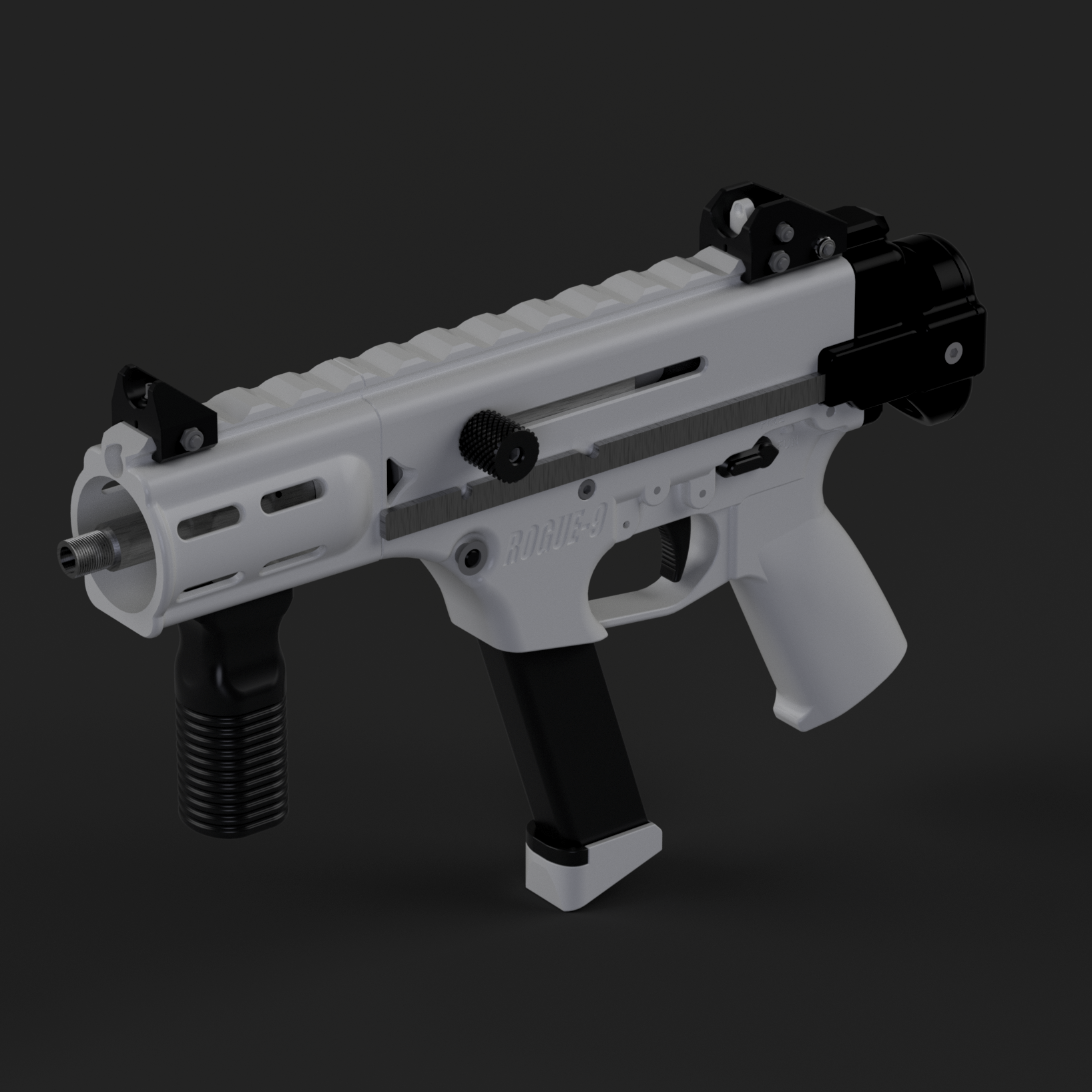 Our Rogue-9 hardware kit contains everything you need to build the main body and magazine for the Rogue-9, including all parts required for the stock, recoil system, printed sights, upper and lower.